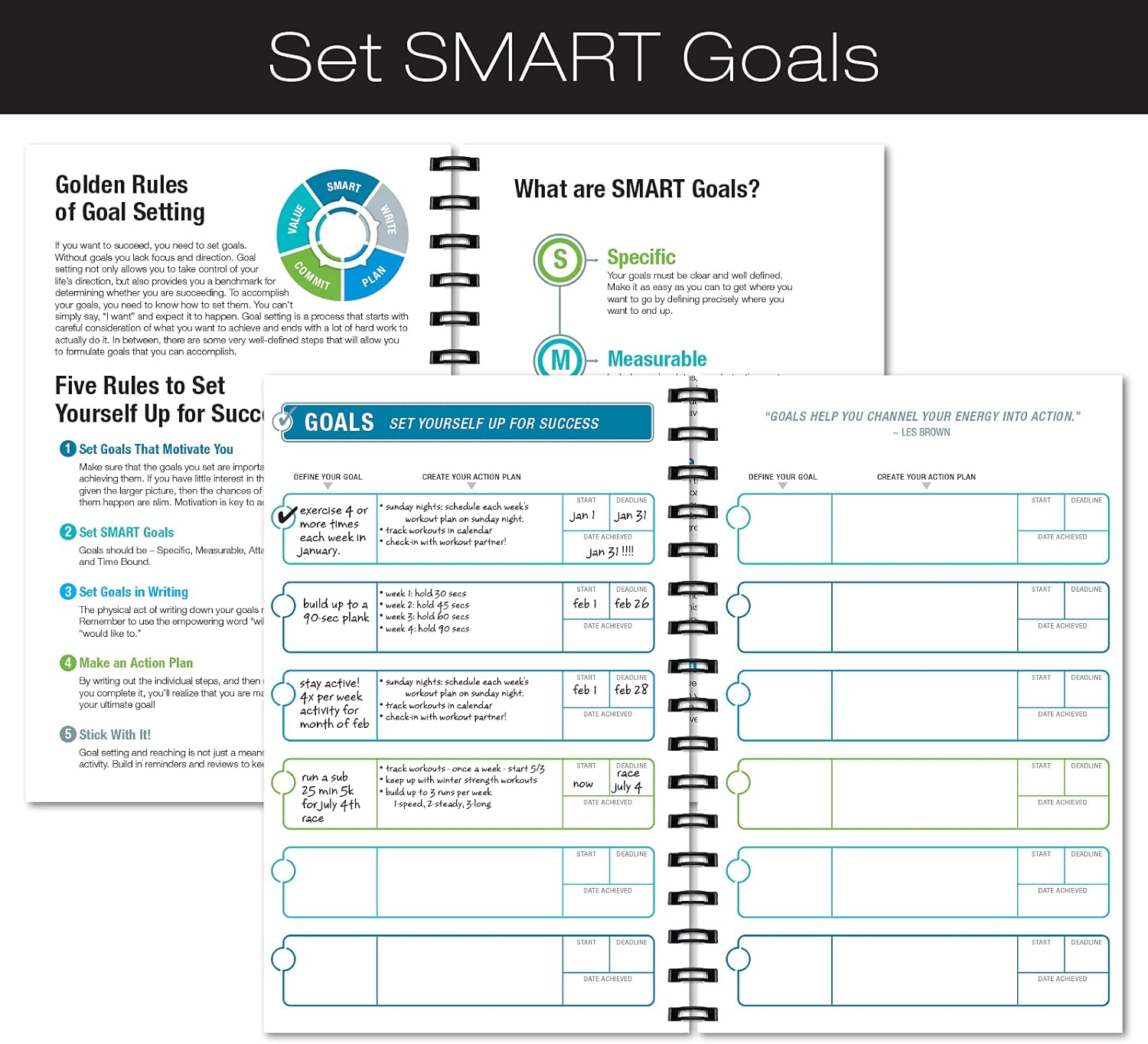 Set SMART goals to keep you on track. Use the journal to define your goals, create your action plan, and set a deadline.
