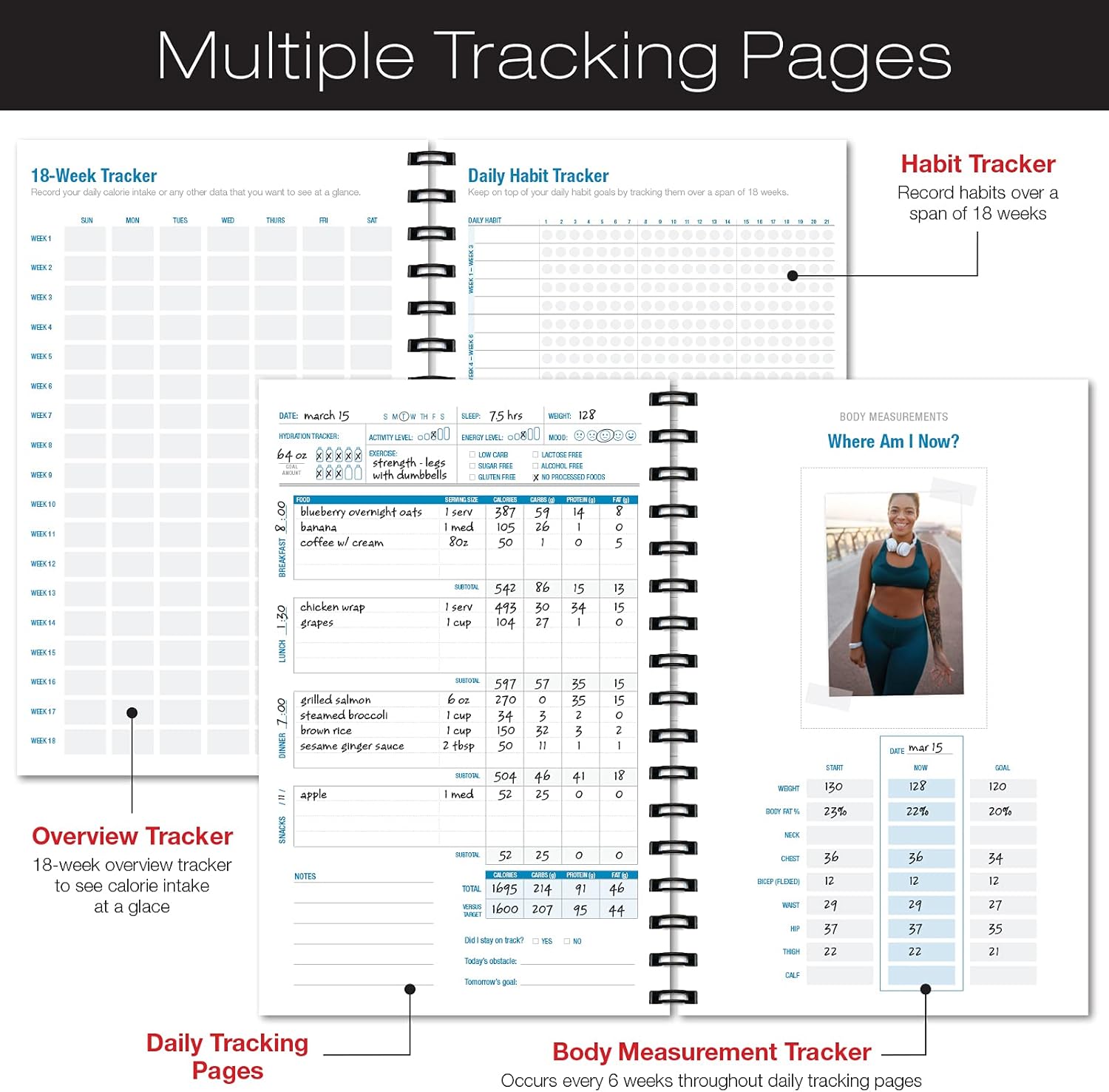 MULTI-TRACKING PAGES – The 18 week tracking pages provide an overview of your progress as well as a record of your daily habits and body measurements.