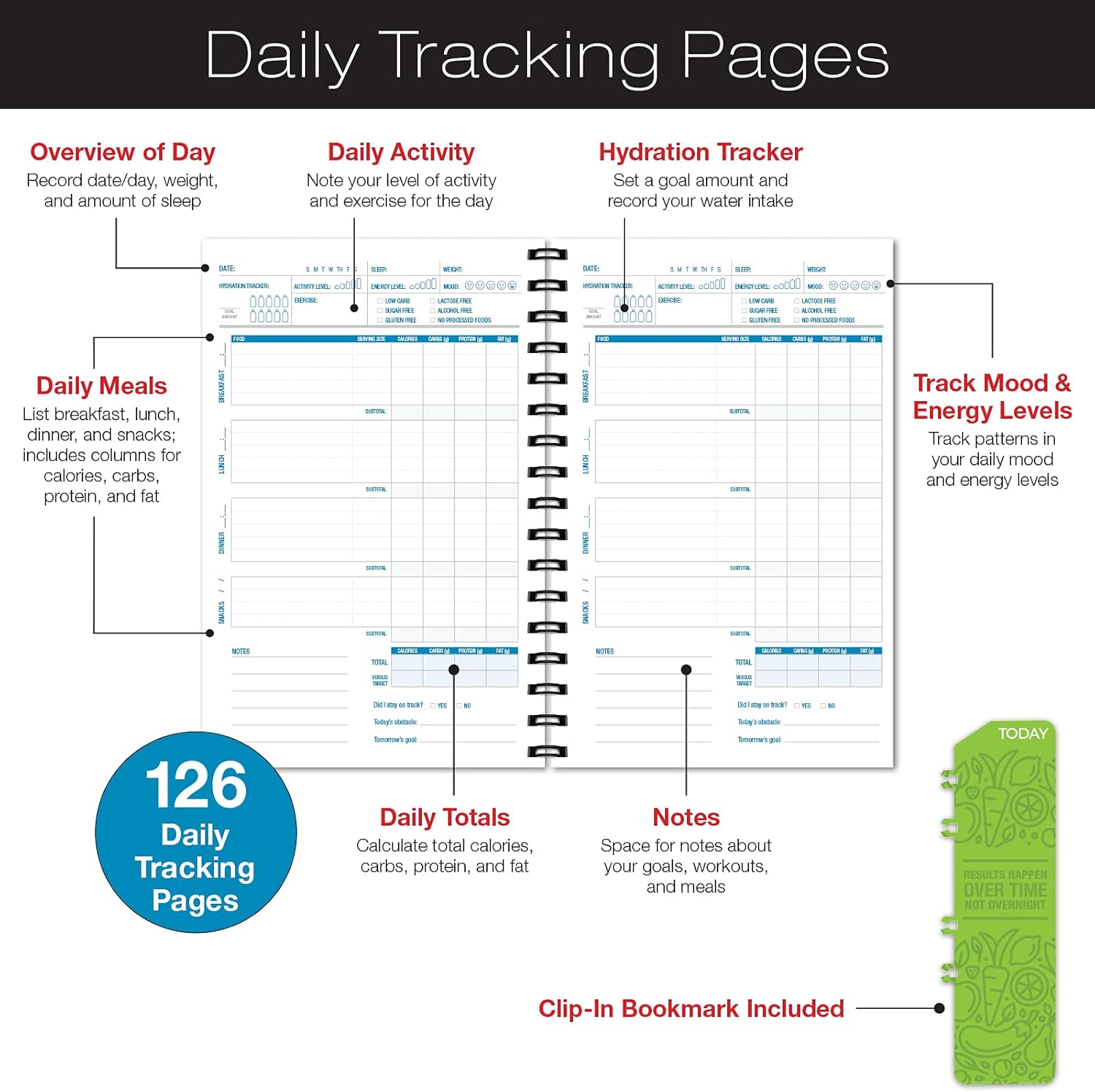 126 Daily Meal Tracking PagesHabit TrackersBody Measurement TrackerClip-in BookmarkNutrition Resource PagesGoal Planning and Progress Tracker