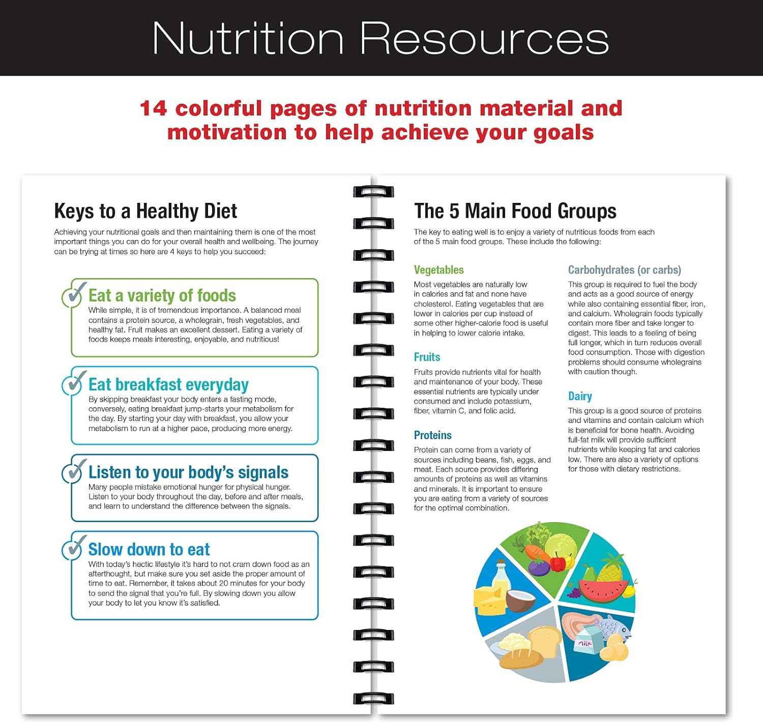 NUTRITIONAL RESOURCES – 14 colorful pages of nutritional material will help keep you focused and motivated towards achieving your fitness goals.