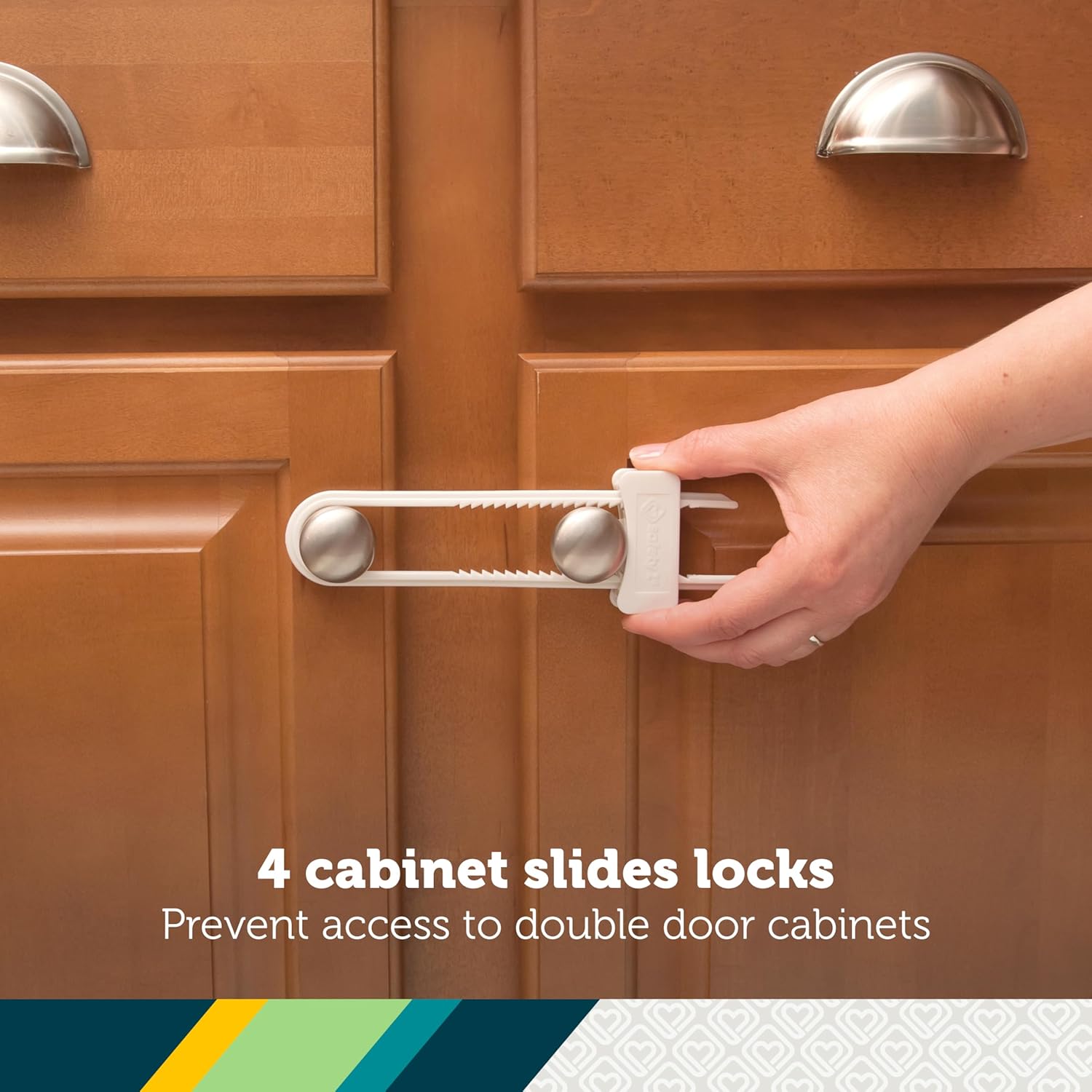 The Home Safeguarding Set by Safety 1st makes it simple to include safety in your plans when preparing the nursery and other rooms of your home for your new baby. These 80 essential safety items will help you make things safer for your new bundle of joy. The set includes 40 plug protectors, 6 Grip ‘n Twist Door Knob covers, 30 Cabinet & Drawer Latches, and 4 Cabinet Slide Locks to help you secure multiple rooms in your home.Outlets are close to the floor and easy for curious children to reach. Installing Plug Protectors helps prevent young children from accessing unused outlets, with a smooth, non-grip design and opaque color that goes unnoticed by children.Some rooms need to be completely out of bounds to little explorers. Grip ‘n Twist Door Knob Covers allow parents easy access to the door knob, but stop young children from entering the room. The covers are easily assembled around your door knob; simply click the two halves together by aligning the interlocking tabs. To use, grab the door knob through the holes in the cover and turn.Cabinets contain cookies, snacks, and other food that children shouldn’t have easy access to. Install Latches on cabinets or drawers and use Cabinet Slide Locks on cabinets that are side by side. These devices help keep curious children from getting inside.Remember, safeguarding the home early will help make things easier for the whole family as your child grows. Begin by preparing the nursery before baby arrives; and the kitchen, bathroom, and other common areas before your baby starts crawling.