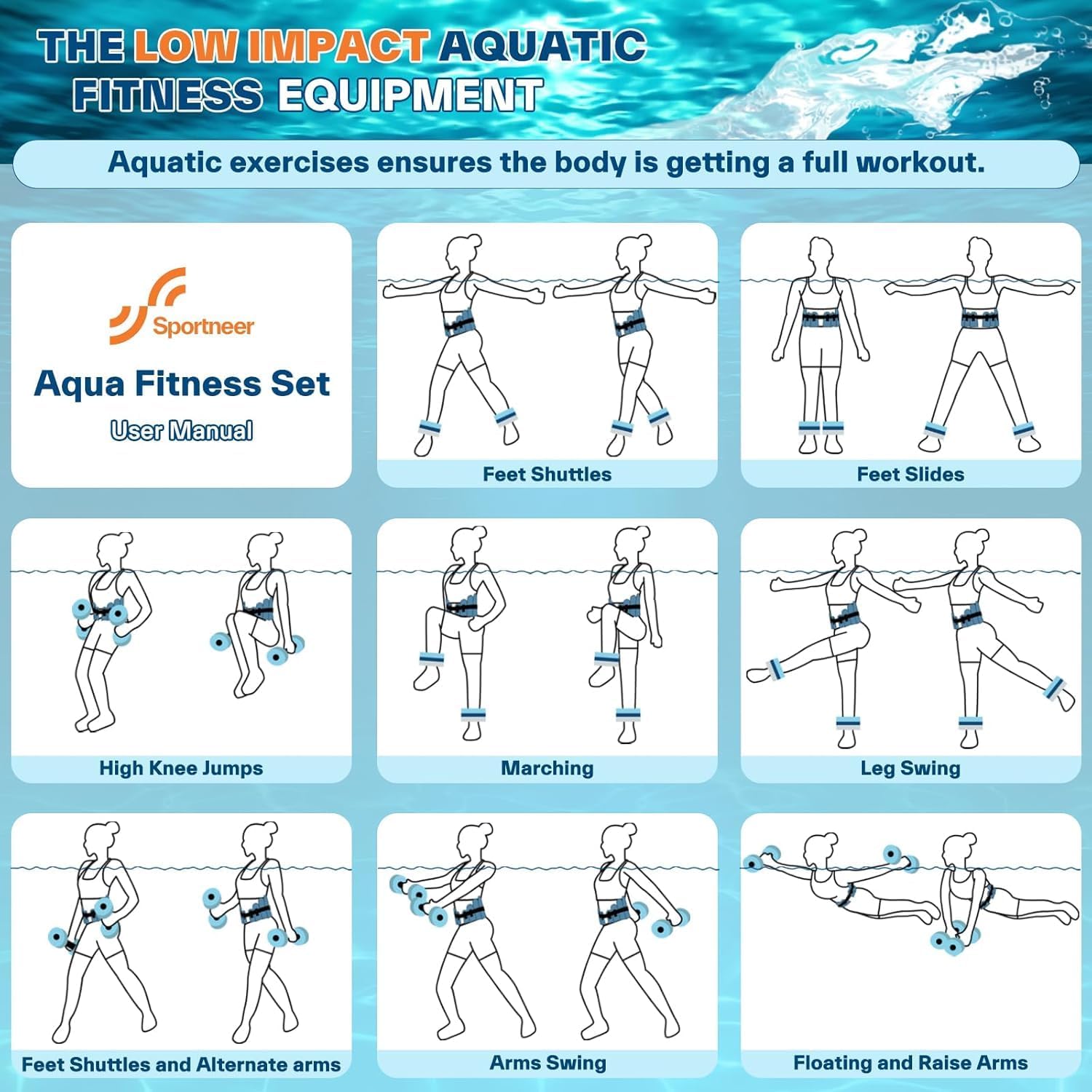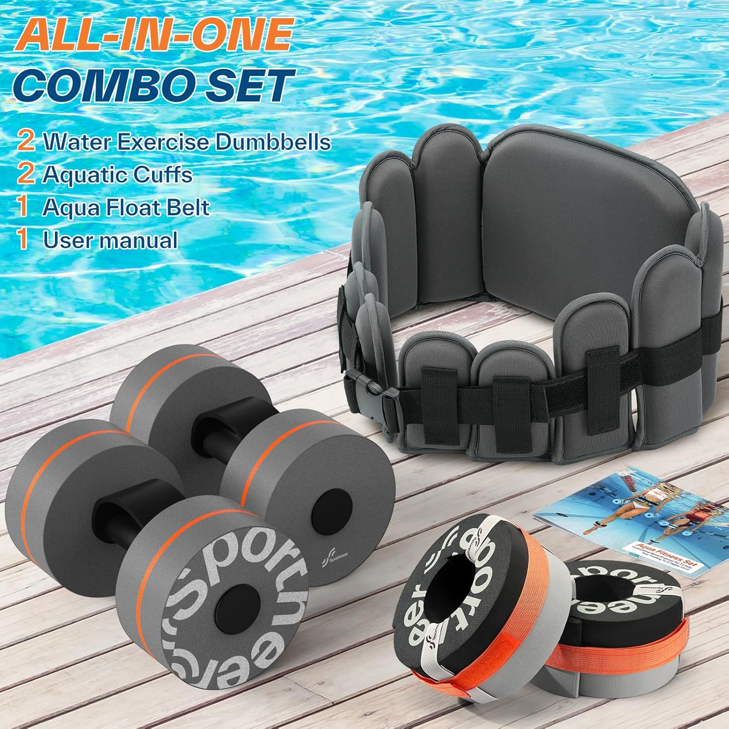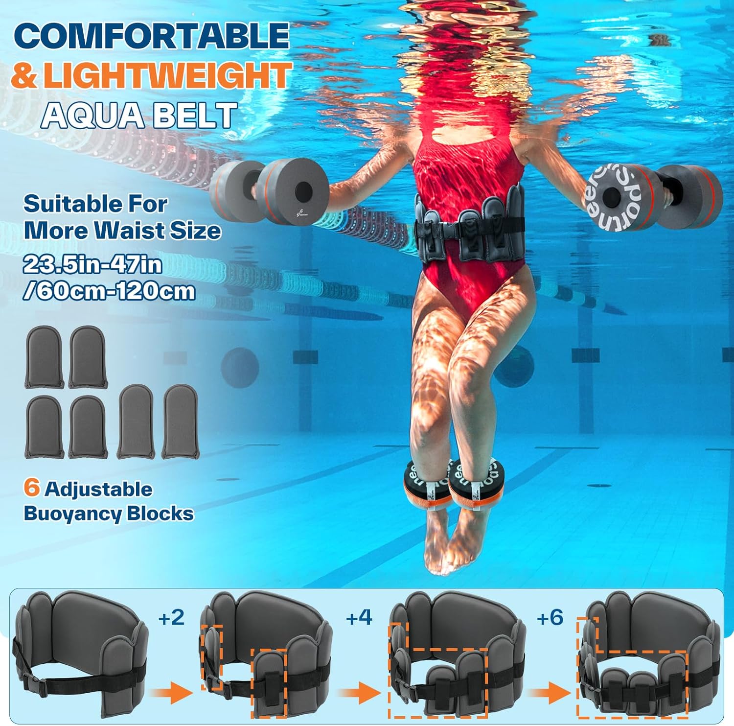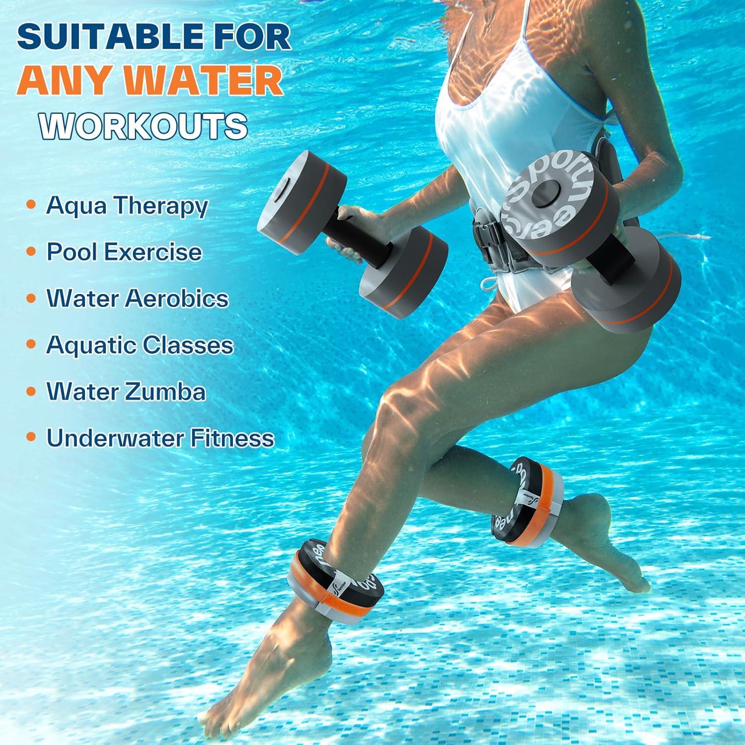 All-In-One Combo Set: This pool exercise equipment set has all the essential tools you need for aquatic exercise. It includes 2 high-density EVA foam water weights, 1 swimming belt, 2 water ankle weights.