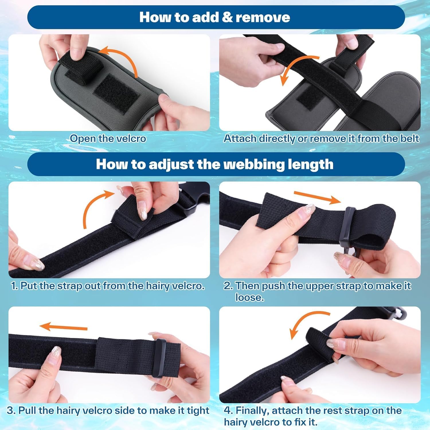 Adjustable Buoyancy: The swim belt has 6 buoyancy blocks which can be freely disassembled and assembled to adjust the buoyancy. The more floating blocks, the more buoyancy. The sticky webbing hook design on the buoyancy block can be freely installed and disassembled, which improves the convenience of adjustment. (please note: the swimming belt fits waist sizes from 23″ to 47″.)